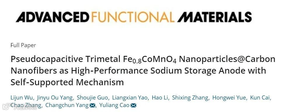 针对上述现象,武汉大学的曹余良教授和郑州大学的杨长春教授等人在国际知名期刊Advanced Functional Materials上发表题为“Pseudocapacitive Trimetal Fe0.8CoMnO4 Nanoparticles@ Carbon Nanofibers as High-Performance Sodium Storage Anode with Self-Supported Mechanism”的文章。本文第一作者是吴利军