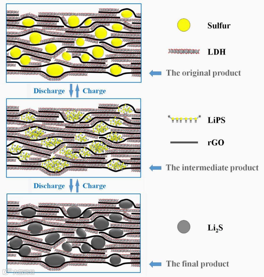 图5为LDH/S/rGO在充放电过程中的组成和结构的变化。LDH/S/rGO优秀的电化学性能可归功于其功能性结构的设计。一方面,rGO层不仅提高了材料的导电性,还为硫颗粒的体积膨胀提供了弹性的空间。