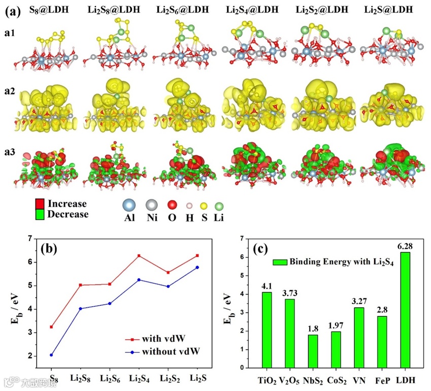 图4为利用第一性原理计算多硫化锂在LDH表面的结合能。基于密度泛函理论(DFT)对LDH纳米片与多硫化锂之间的相互作用进行了理论模拟。