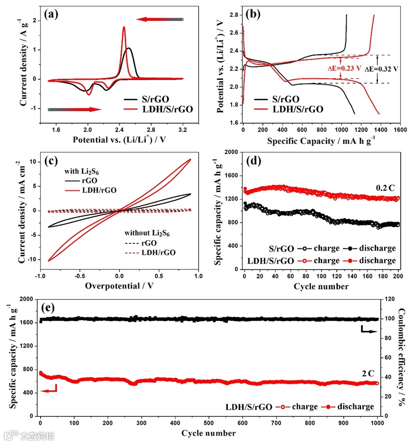样品的循环伏安图(图3a)显示S/rGO在2.23和1.96V有两个还原峰,对应固体硫与锂离子反应形成可溶的多硫化锂中间产物到最终的固体Li2S2/Li2S的多步过程,在2.51V的氧化峰对应上面反应的逆反应过程。与S/rGO相比,LDH/S/rGO的氧化还原峰分别移到2.26,2.02和2.45V,说明LDH纳米片的引入可以减少电极的极化,加速锂化过程。