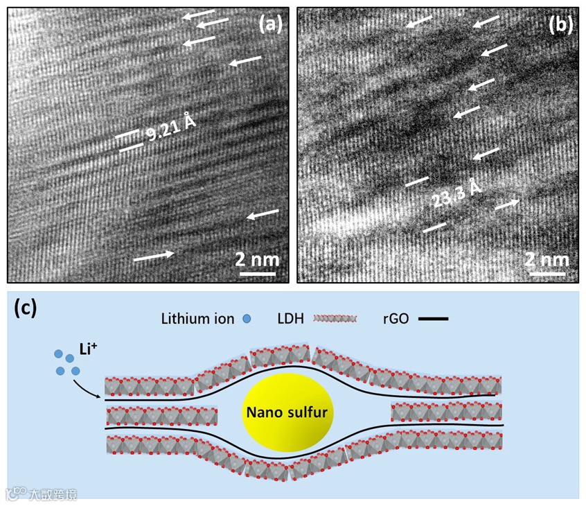 LDH/S/rGO的(a,b)HRTEM图和(c)嵌入在LDH层中硫颗粒的结构示意图
