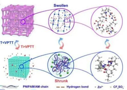 聚N-异丙基丙烯酰胺(PNIPAM)水凝胶是一类具有多孔网络的热响应性聚合物,当温度超过其体积相变温度(VPTT)时,由于PNIPAM链中分子内氢键的形成而收缩,受此启发,作者制备了基于PNIPAM的水凝胶,对ZIBs的分离器进行了改性。这种基于PNIPAM水凝胶层的多孔结构受温度控制良好,在高温下几乎消失,伴随着表面润湿性从亲水性转变为疏水性。这将抑制电解液离子在电极之间的迁移,实现高温下ZIBs的自我保护。