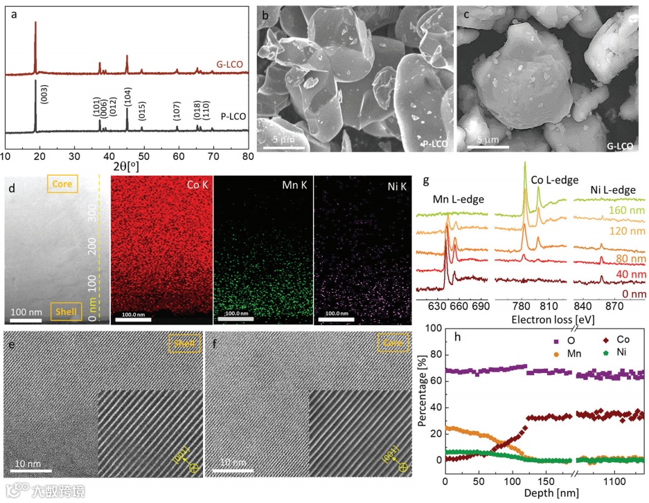 (2)传统的包覆方法往往容易在颗粒表面生成岛状颗粒,不能有效阻止高压循环中的GOM。因此,如何构建完整的LiMn1.5Ni0.5O4壳层将LCO完全包覆以阻止GOM,而且还要实现共晶格以保证快速的Li+扩散是关键,之前还没有研究实现这个目标。