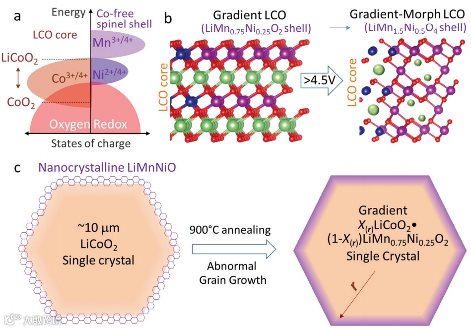 从保护高压钴酸锂的阴与阳离子混合氧化还原反应(HACR), 防止氧逃逸的角度讲, 高压镍锰酸锂应该是是最好的包覆层材料。以前苦于无法全部包好。现在通过在大单晶基体上异常晶粒长大,得到亚稳态的LiMn0.75Ni0.25O2,这种层状结构在块体态是不稳定的,但是在共格薄膜条件下作为梯度纳米层是可以合成并全润湿的。在电池化成时,前置的Mn :Ni :O的比例保持3:1:8,而层状LiMn0.75Ni0.25O2相变为高压镍锰酸锂,保持全润湿壳层,从而达到了稳住HACR 防止氧逃逸的目的,在贫电解液条件下达到了良好的全电池循环效果。