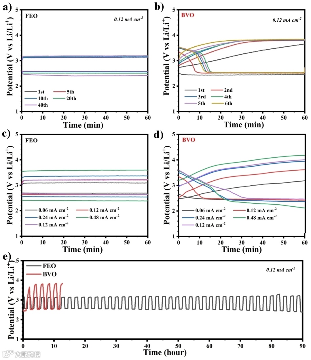 图5. α-Fe2O3和BiVO4的(a-b)电流密度为0.12 mA cm-2时的放电/充电曲线;(c-d)不同电流密度下的放电/充电曲线;(e)循环曲线图