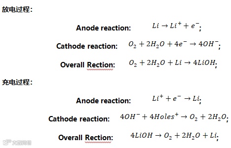设计组装成正极以水溶液为电解液的杂化水系锂-氧电池,并直接采用两种不同光电半导体为正极。测试过程中的电化学反应机理明确,无有机电解液中各类副反应的存在,基本反应如下: