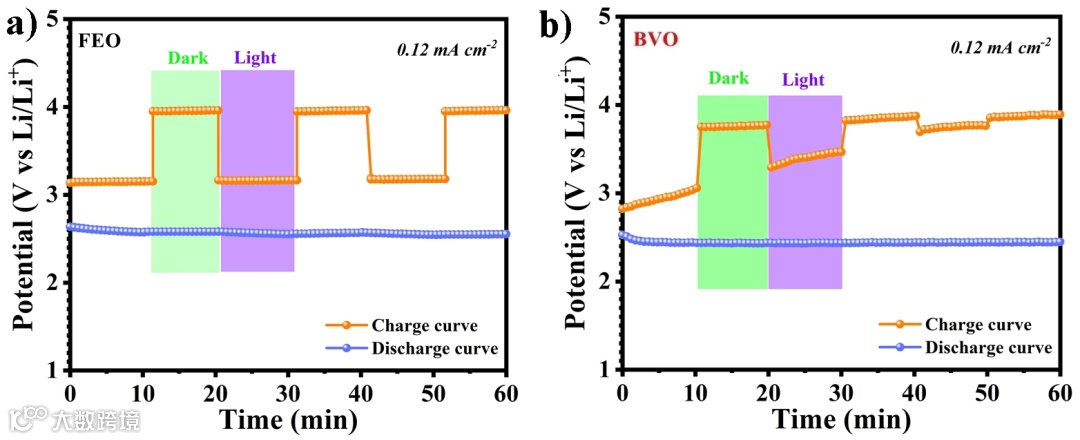 图4. (a-b) α-Fe2O3和BiVO4的在开关灯条件下的杂化水系锂-氧电池曲线图