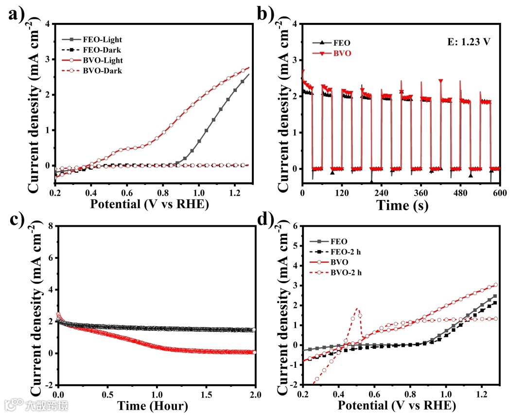 图1 两种光阳极的形貌与晶体结构表征。作者在光电水分解领域选用了具有代表性的两种光电半导体材料,α-Fe2O3纳米棒和BiVO4纳米片。在前期研究中同样也合成过具有代表性的金属硫化物以及WO3等,但这类半导体材料在碱性电解液中具有极差的化学稳定性,非常容易发生分解。因此通过简易的水热法获得形貌与结构规整的两种较为稳定的半导体材料。α-Fe2O3纳米棒和BiVO4纳米片在传统光电水分解中,均具有高的电子-空穴分离能力,能够产生大量的空穴用于水氧化过程。结合SEM图,两种半导体材料均为阵列生长,纳米棒之间或纳米片之间留有足够的空间,能与电解液充分接触,提供足够的反应活性位点,有利于光生空穴进行水氧化反应。