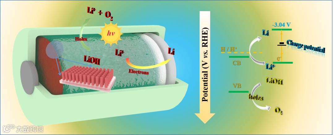 机理示意图:光辅助水系锂-氧电池结构与原理示意图