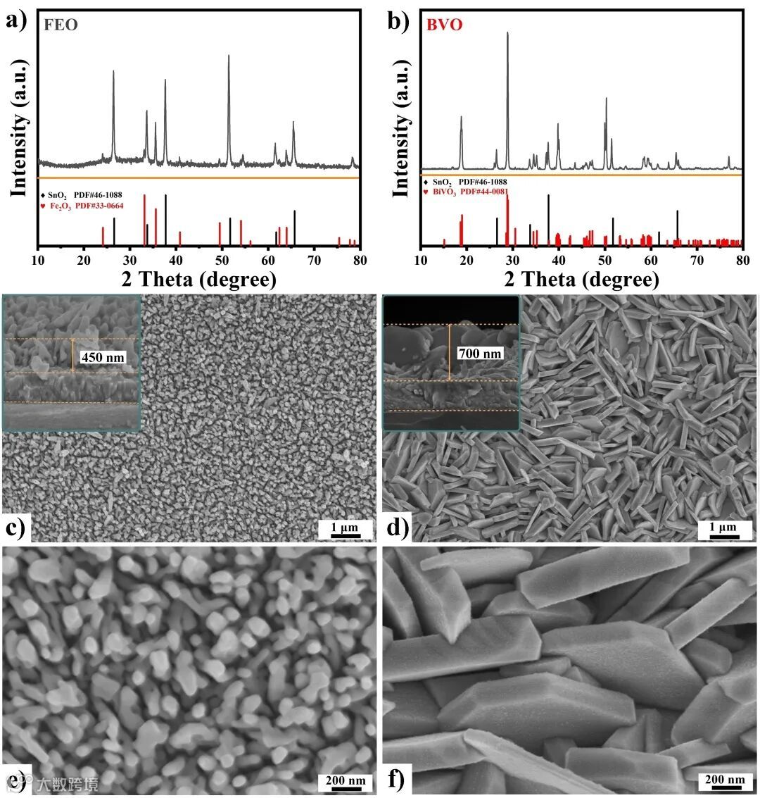 图1. 光阳极材料的表征:(a-b) XRD;(c-f) SEM;(c,e)α-Fe2O3纳米棒;(d,f) BiVO4纳米片
