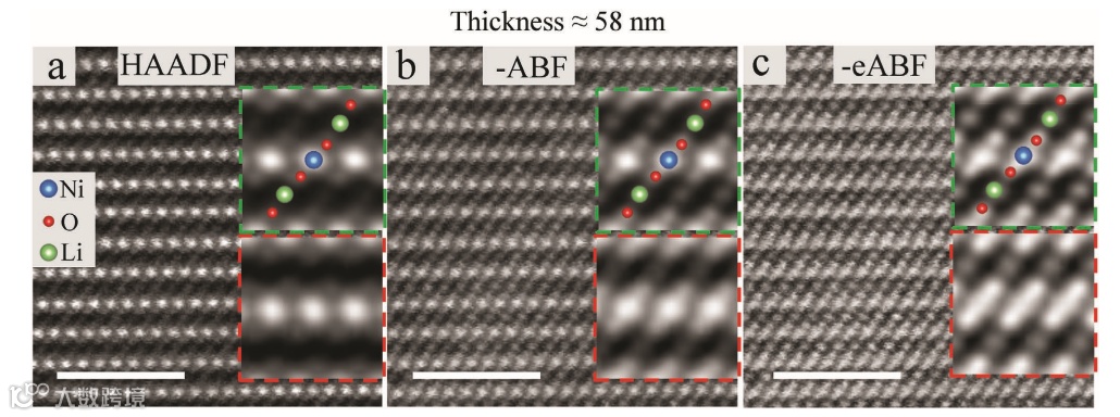 对于CAMs来说,成像锂和氧等轻元素的困难是理解原始样品和电化学循环样品的结构变化的主要障碍。Shao-Horn等报道了通过使用常规TEM记录焦距序列来直接观察LCO中锂的情况。遗憾的是,严格的样品厚度要求和复杂的模拟步骤使得这项技术非常繁琐。最近,Lozano等人将像差校正的STEM和像素化检测器结合起来,使用ptychography技术成像Li1.2Mn0.6Ni0.2O2中的锂。尽管成像具有高信噪比和低电子剂量的优点,但该技术也对样品厚度有要求并需要大量的图像后处理。2009年首次使用ABF成像技术观察到轻元素后,进行了几项研究,对LCO和其他含锂CAMs中的锂进行成像。Findlay等人对锂的原子分辨率成像条件进行了模拟研究。显示了在不同区域轴上对含锂化合物中锂进行成像的可能性。然而,本研究未考虑普通样品制备、离子束和电子束损伤以及探测器噪声等实验因素的影响。Findlay等人的最新研究表明,通过从ABF强度中减去中角度亮场(MABF)强度,可以增强较轻原子与背景的对比度。发生这种情况的原因是,由于电子通道的作用,轻元素在MABF区产生强烈的信号。这种在不同角度范围结合强度的想法是由Rose等人首次提出的。