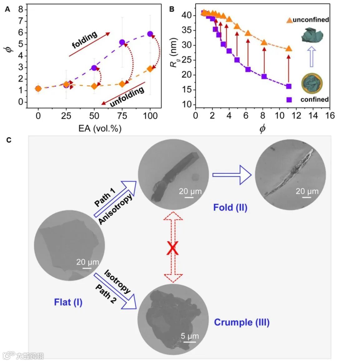 图 5:溶液中二维GO大分子构象转变的可逆性和路径依赖性。 (A) EA/DMF体系中GO大分子构象转变的可逆性的实验结果。(B) EA/DMF体系中GO大分子构象转变的可逆性的模拟结果。(C) GO大分子构象转变的路径依赖性示意图。