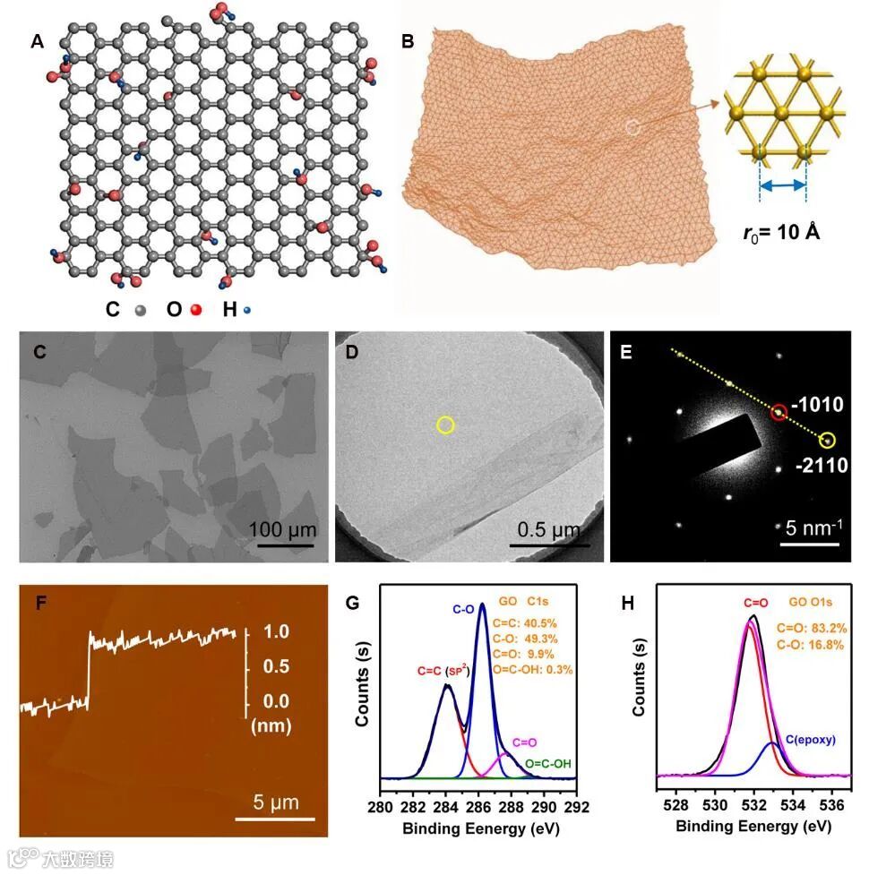 团队合成了单层超大片GO,厚度0.8-1 nm(图1F), 横向尺寸约达100 um (图1C),碳氧比约1.8(图1G-H)。TEM选区衍射图显示出单层石墨烯特征的六边形尖斑,表明了GO存在一定的晶格有序性(图1D-E)。