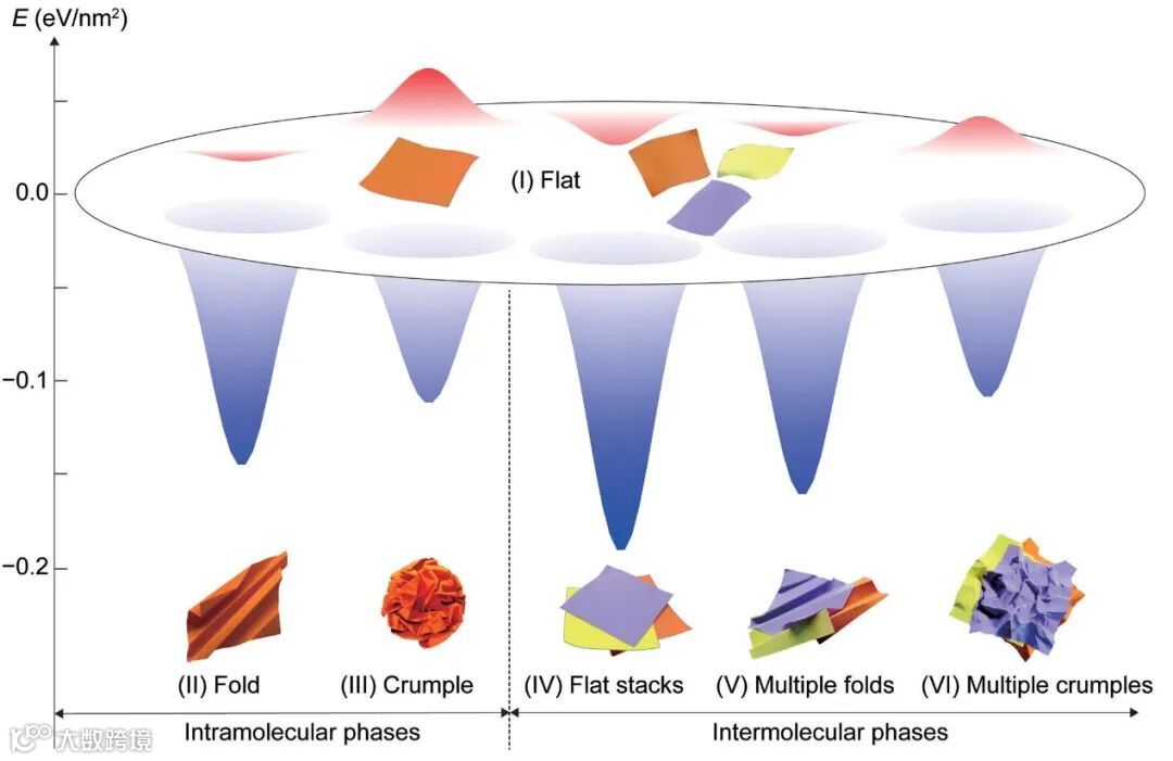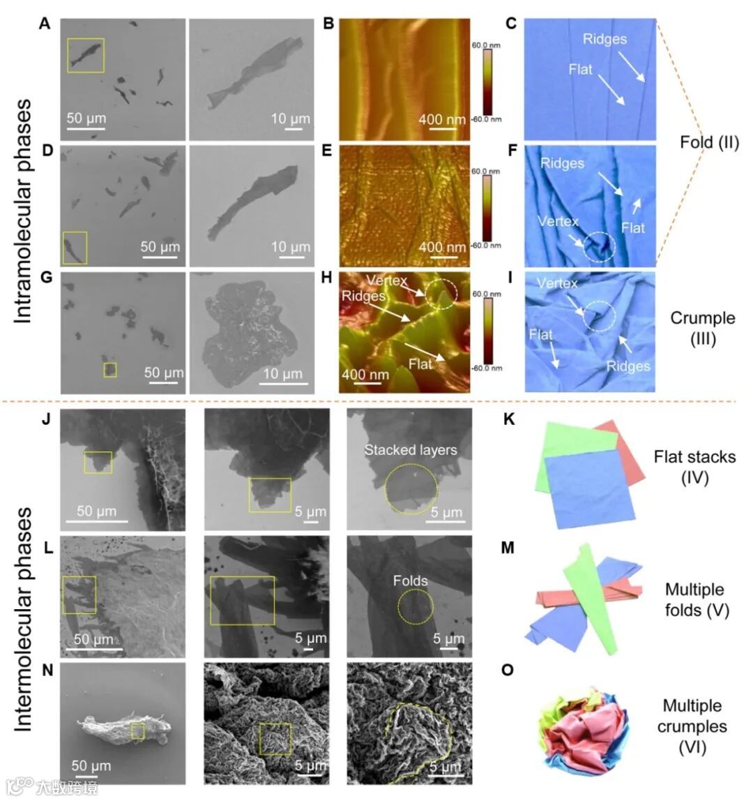二维GO大分子在溶液中的构象相图:实验观测确证,二维大分子在溶液中存在以下丰富的构象。其中,单分子构象有平直相 (I)、条状折叠相(II)和球状褶皱相(III);多分子构象包括平叠相 (IV)、多片条状折叠相(V)和多片球状褶皱相 (VI)。