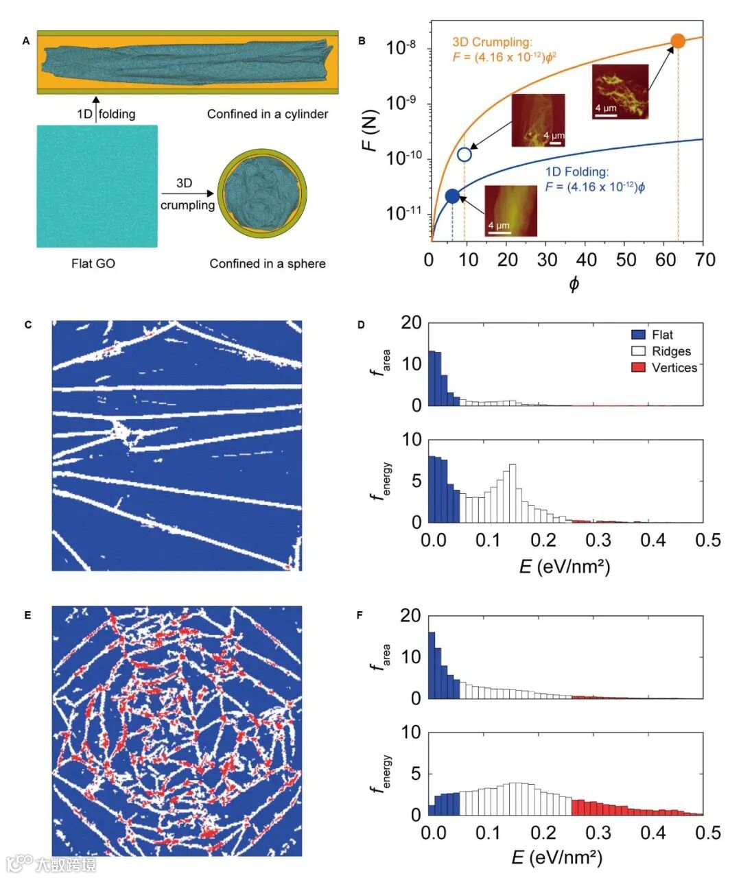 图6:不同构象GO片展开后的表面应变能密度分布, 计算中用到的方形GO片边长尺寸和表面能分别为L = 200 nm和 Ea =0.1 eV/nm2。(A)对称约束下GO分子构象变化的CGMD模拟示意图。(B)维持不同构象需施加的外力。(C-F)GO片初始平直相上的势能分布,以及折叠相(C和D)和褶皱相 (E和F)的面积 (farea)和应变能比例(fenergy)的能量分布。根据几何特征,总能量可分为三个部分:平面(蓝色)、脊(白色)和顶点(红色)。
