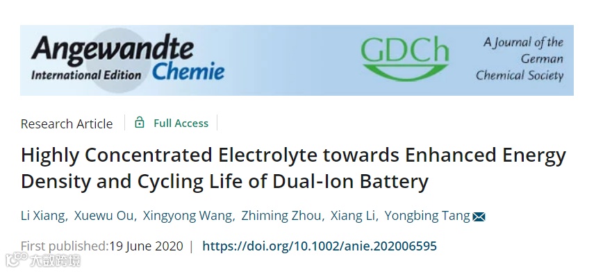 基于以上现状,中国科学院深圳先进技术研究院的唐永炳研究员等在国际知名期刊Angew. Chem.上发表题为“Highly Concentrated Electrolyte towards Enhanced Energy Density and Cycling Life of Dual-Ion Battery”的论文。Li Xiang为本文第一作者。