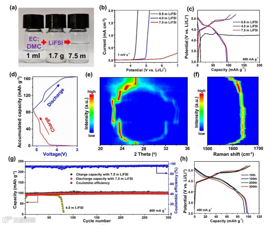(a) The optical images of EC:DMC 1:1 (v/v) solvent, LiFSI salt, and as-prepared 7.5 m LiFSI electrolyte. (b) The comparison of LSV results with 0.8 m, 4.0 m, and 7.5 m LiFSI. (c) The galvanostatic charge/discharge curves of Li-graphite half-cell with 0.8 m, 4.0 m, and 7.5 m LiFSI. (d) Typical charge/discharge curve of Li-graphite half-cell with 7.5 m LiFSI electrolyte. (e) In situ XRD and (f) in situ Raman measurements during the charging/discharging process with 7.5 m LiFSI electrolyte. (g) Comparison of long cycling performance of Li-graphite half-cell with 4.0 m and 7.5 m LiFSI. (h) Charging/discharging curves of selected cycles for 7.5 m LiFSI electrolyte..