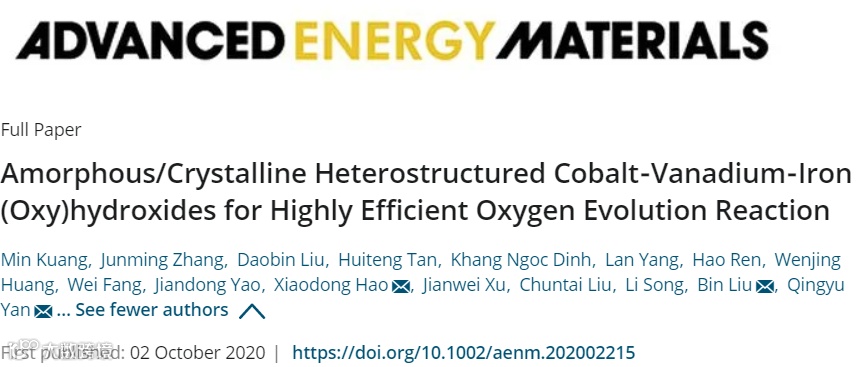 郝晓东/Bin Liu/Yan Qingyu教授AEM:用于高效析氧反应的无定形/结晶异质结构钴-钒(氧)氢氧化物