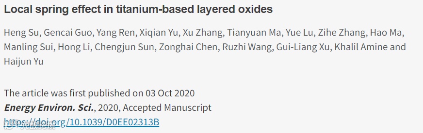 近日,北京工业大学材料与制造学部尉海军教授课题组在国际顶级期刊Energy & Environmental Science (影响因子:30.289) 上发表题为“Local spring effect in titanium-based layered oxides”的研究工作,该工作得到了美国阿贡国家实验室Khalil Amine教授在同步辐射谱学测试和北工大王如志教授在理论计算方面的支持。