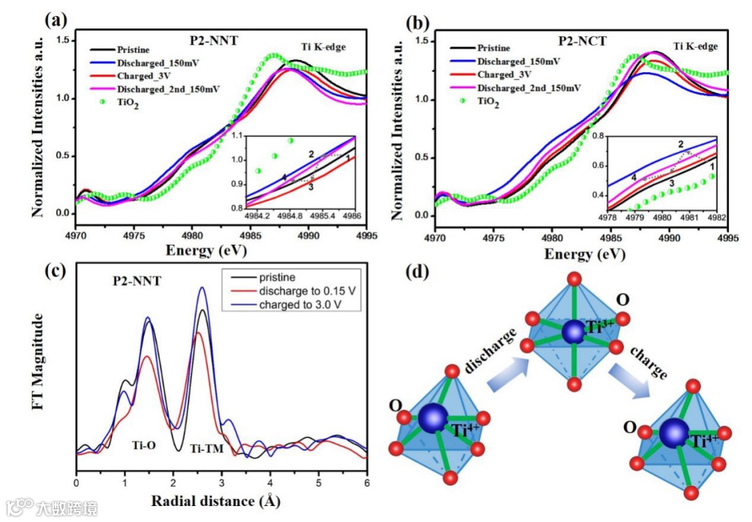 作者对两种材料开展了X射线吸收谱测试,结果发现两种材料在循环过程中,Ti元素的价态变化为钠离子脱嵌过程提供了电荷补偿作用。特别地,根据Ti元素的EXAFS谱线结果,两种材料在初始状态和充电结束后Ti-O键出现了明显的峰位偏移,而这种现象在Ni和Co元素的吸收谱中并没有出现。