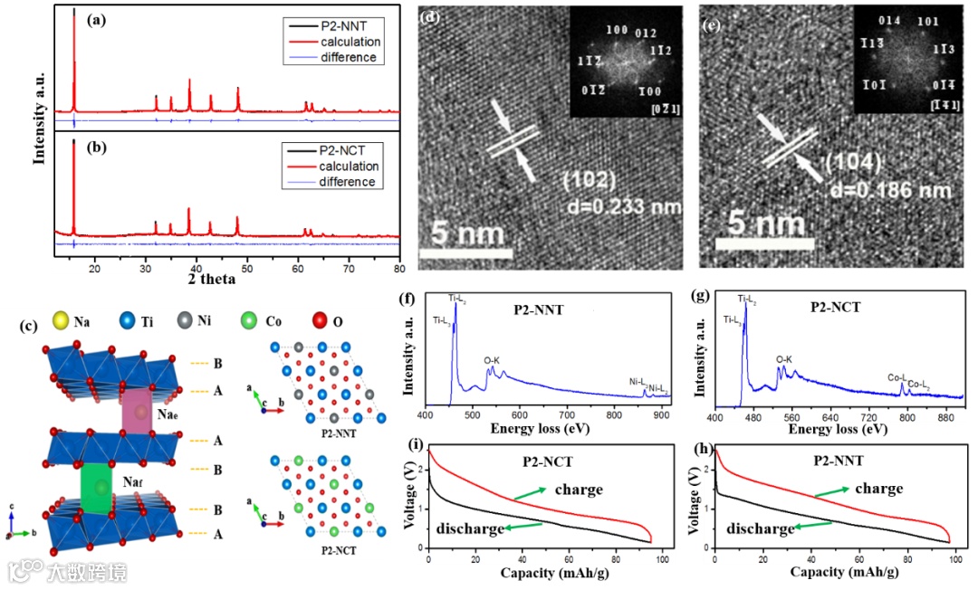 (h, i) The charge and discharge profiles of P2-NNT (h) and P2-NCT (i) at the voltage range of 0.15 V-2.5 V in the second cycle.