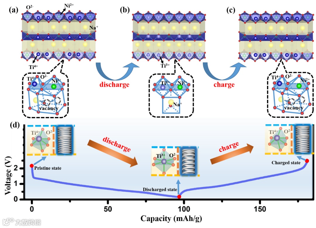 (d) The “spring effect” of TiO6 octahedrons and the corresponding discharge/charge process.