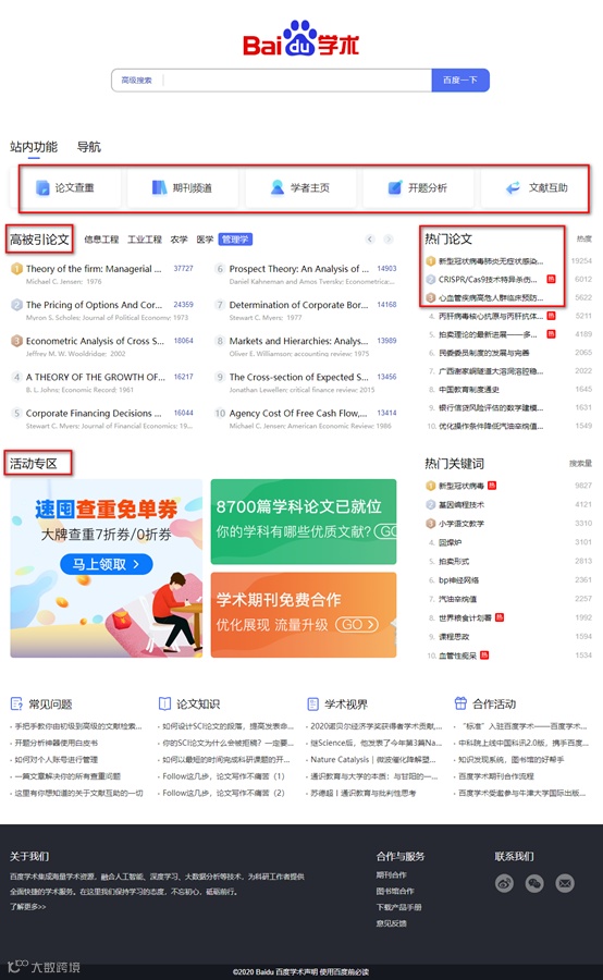 打开百度学术,网页板块跟小通读研时候有了很大的改变,增加了很多科研求学必用的一些功能,像论文查重,开题分析,热点推荐等等。