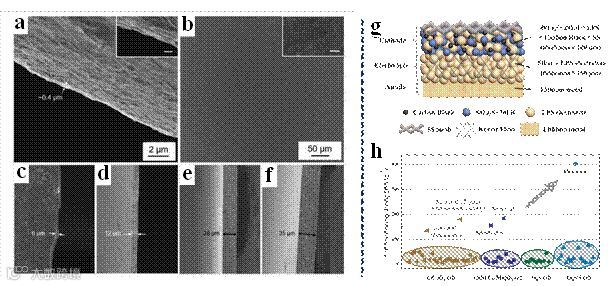 (a-f)采用液相法合成的0.4 至 35 微米不同厚度的β-Li3PS4固态电解质膜。
