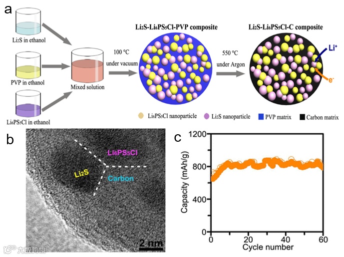 (b)所得Li2S-Li6PS5Cl-C纳米复合物的TEM形貌。(c) Li2S-Li6PS5Cl-C在50 mA g-1下的循环性能。