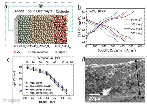 (a)含双层固态电解质的Li/75%Li2S-24%P2S5-1% P2O5/Li10GeP2S12/hc-VS2全固态锂电池结构示意图及其(b)不同电流密度下充放电曲线。(c) 不同组分下PEO-LiTFSI-LGPS的Arrhenius曲线图。