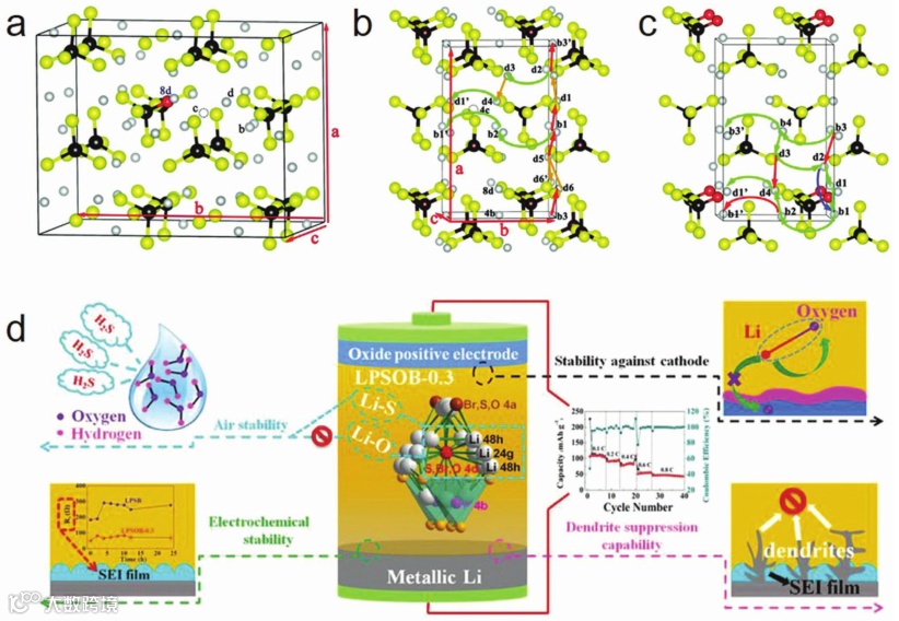 (d)O掺杂Li6PS5Br提高空气稳定性、电化学稳定性示意图。