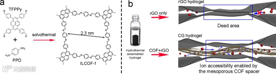 选择这个亚胺键连接的二维COF(ILCOF-1)是因为它拥有独特的二维片层结构,同时带有大量的可调控的介孔 (图1示例)。ILCOF-1可以用常规的溶剂热合成法制得。rGO/COF复合材料可以通过180 oC的水热反应合成。