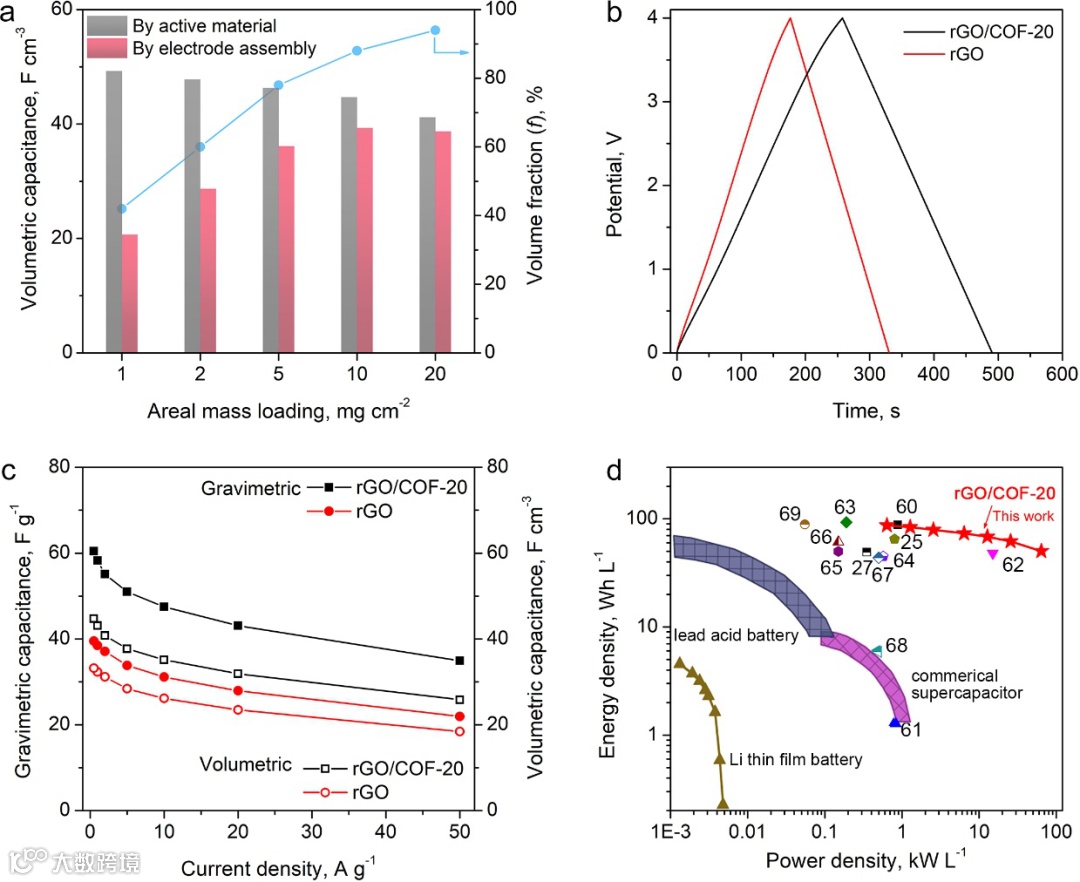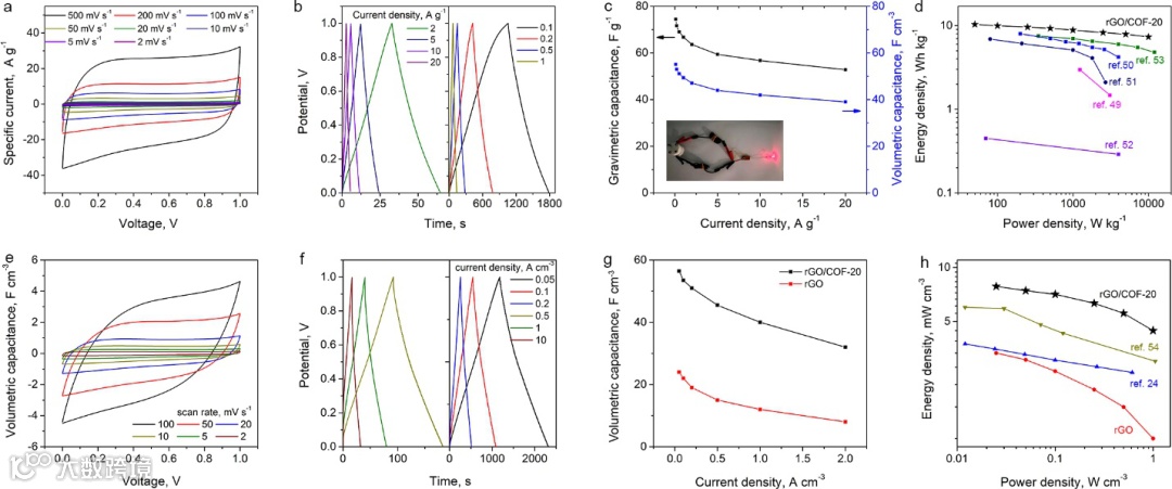用rGO/COF-20组装的薄膜超级电容器(使用硫酸水溶液电解质)和纤维状超级电容器(使用磷酸/PVA凝胶电解质)都展现了优异的储能性能。薄膜超级电容器在50 W kg−1功率密度下的储能密度达到10.3 Wh kg−1。20000次充放电以后,还能保持88%的初始电容和近100%的库伦效率。适用可穿戴器件储能的纤维状超级电容器在体积功率密度25 mW cm−3下的体积能量密度可以达到7.9 mWh cm−3 。