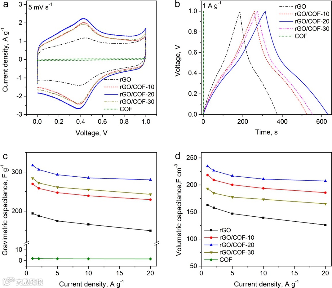 硫酸水溶液电解质中进行的三电极测试显示rGO/COF主要通过双电层电容储能。COF插入显著提升储能性能。加入10,20,30%重量比的COF, rGO/COF的质量密度电容分别是rGO的1.39,1.55和1.49倍。而COF本身重量电容密度只有10 F g−1。