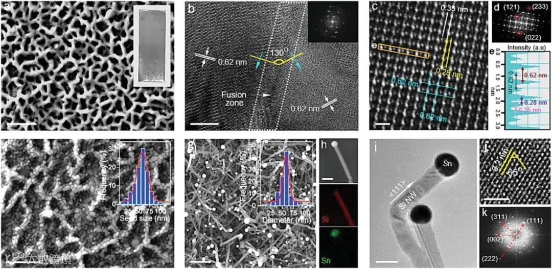 在本工作中,作者开发了一种高度灵活且机械强度高的二元3D CuxSiy纳米泡沫,作为一种通用的无粘合剂CC,可有效地生长高密度的高密度Si NW。在大多数系统中不希望形成硅化铜颗粒的中间层,作者成功地控制了硅化物的形成,以通过限制其以2D网络结构的形式发挥其最佳性能。
