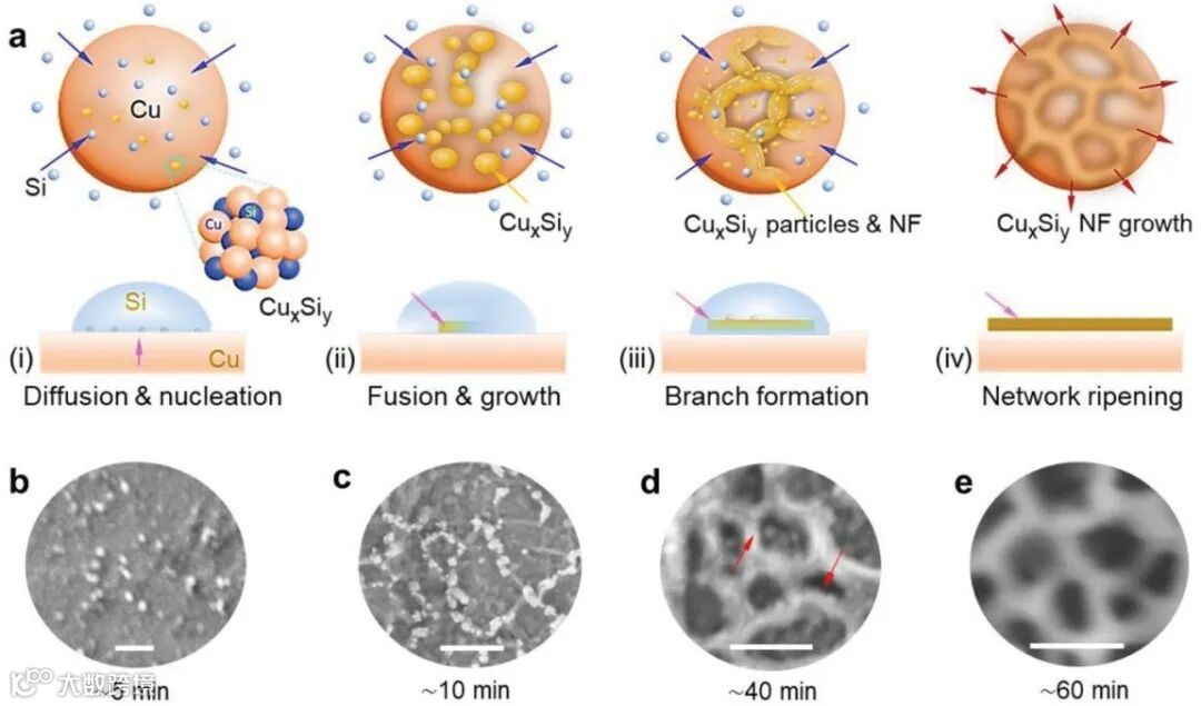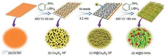 图1. 3D CuxSiyNF和高密度M-seeds Si NW的合成示意图