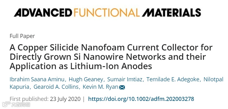 近日,爱尔兰利莫瑞克大学Kevin M. Ryan课题组在国际顶级期刊Advanced Functional Materials (影响因子:15.621) 上发表题为“A Copper Silicide Nanofoam Current Collector for Directly Grown Si Nanowire Networks and their Application as Lithium‐Ion Anodes”的研究工作。
