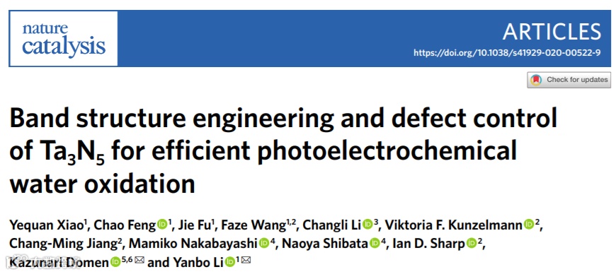 李严波教授最新Nat Catal: Ta3N5的能带结构工程与缺陷调控用于高效光电化学水氧化