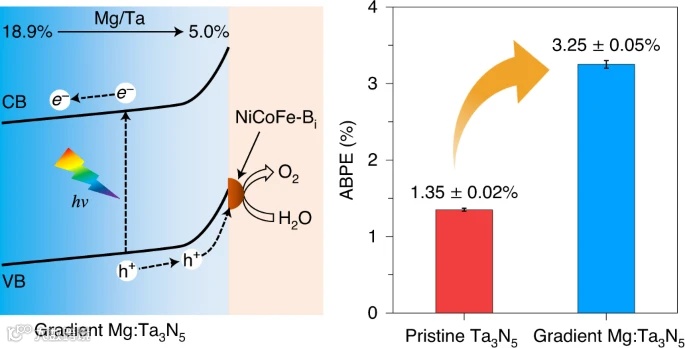 要点二:结果表明,当梯度Mg:Ta3N5光阳极与硼酸盐插层镍钴铁氧氢氧化物(NiCoFe-Bi)析氧反应共催化剂相结合时,梯度Mg:Ta3N5光阳极具有低的起始电位(0.4 VRHE)和高偏置光电转换效率(3.25 ± 0.05%)。