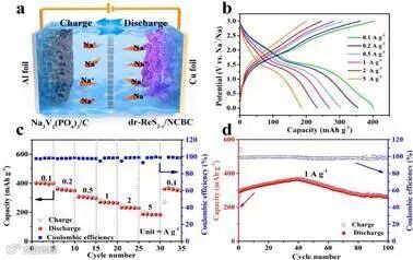 a)dr-ReS2-x/NCBC负极和Na3V2(PO4)3/C正极组装的钠离子全电池的示意图。