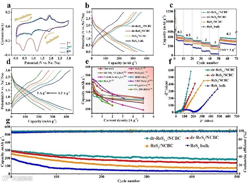 f)dr-ReS2-x/NCBC,dr-ReS2/NCBC,ReS2/NCBC和ReS2的阻抗曲线。g)dr-ReS2-x/NCBC,dr-ReS2/NCBC,ReS2/NCBC和ReS2在5 A g-1下的循环性能。