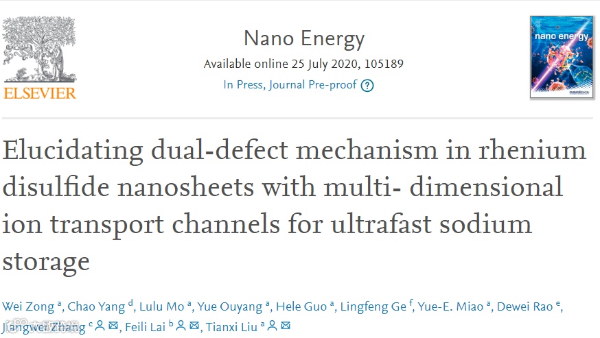 近日,东华大学刘天西教授课题组联合比利时鲁汶大学赖飞立博士以及中国科学院大连化学物理研究所张江威博士在Nano Energy上发表题为“Elucidating Dual-Defect Mechanism in Rhenium Disulfide Nanosheets with Multi-Dimensional Ion Transport Channels for Ultrafast Sodium Storage”的研究工作。