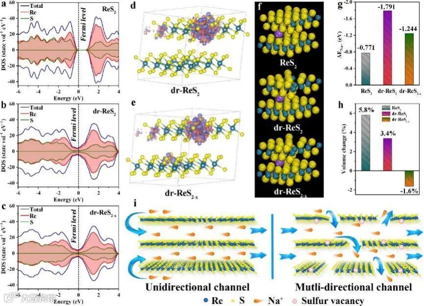 d,e)dr-ReS2和dr-ReS2-x的差分电荷密度分布图。