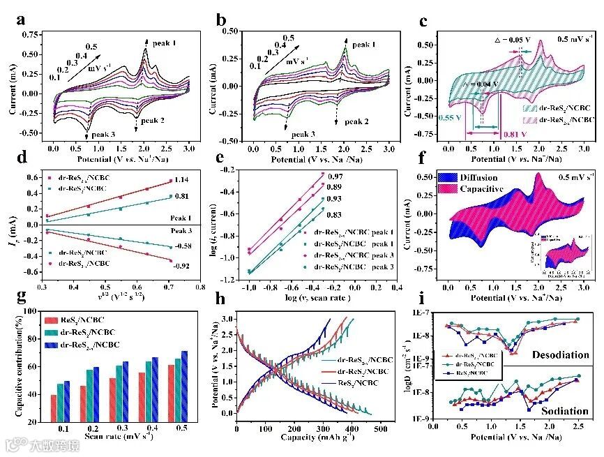 g)dr-ReS2-x/NCBC,dr-ReS2/NCBC,ReS2/NCBC的电容贡献的比例。dr-ReS2-x/NCBC,dr-ReS2/NCBC,ReS2/NCBC的h)GITT分布图以及