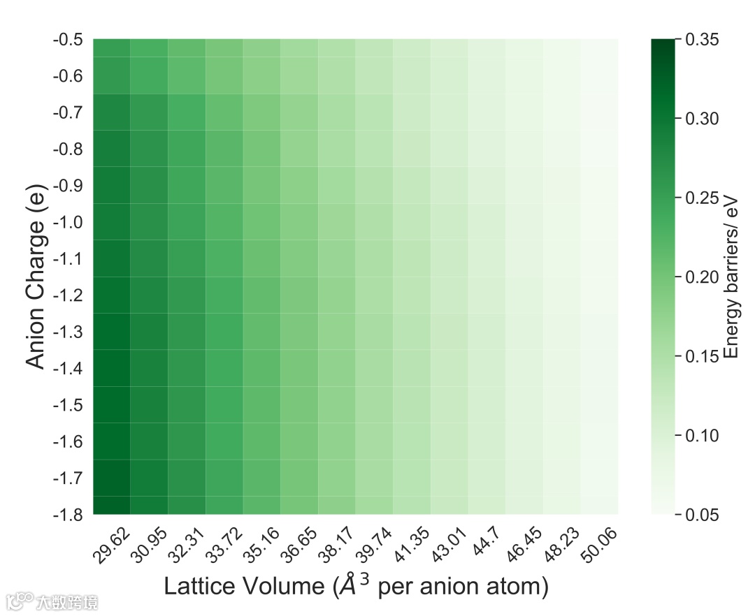 从热度图(图2)可以得出的最重要结论是,活化能Ea相较于阴离子电荷更依赖于晶格体积。在整个阴离子电荷和晶格体积空间中,少量的阴离子电荷和大的晶格体积会导致Ea降低。因此,对于具有bcc型阴离子亚晶格的锂化合物,实现快速锂离子迁移需要少负电荷,大晶格体积(锂-阴离子键长)。
