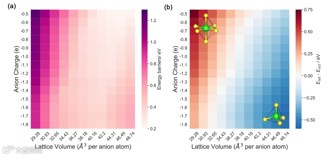 (a))Oct-Tet 迁移路径活化能垒相对于不同的阴离子电荷和晶格体积,