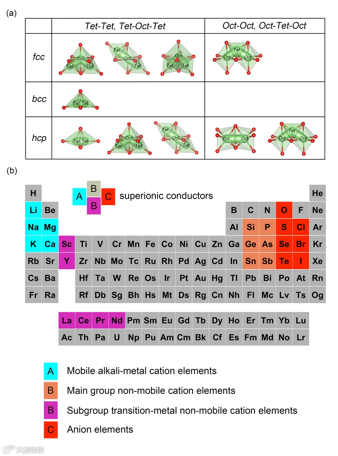 2) 对于具有八面体占据的A离子超导体,阴离子元素C和非移动阳离子元素B之间的大电负性差异对于获得A离子沿Oct-Oct和Oct-Tet-Oct路径的快速扩散至关重要(图4a),合适的非移动阳离子元素B应该优先于选择位于元素周期表左下方且电负性较小的过渡金属元素,如图4b所示。