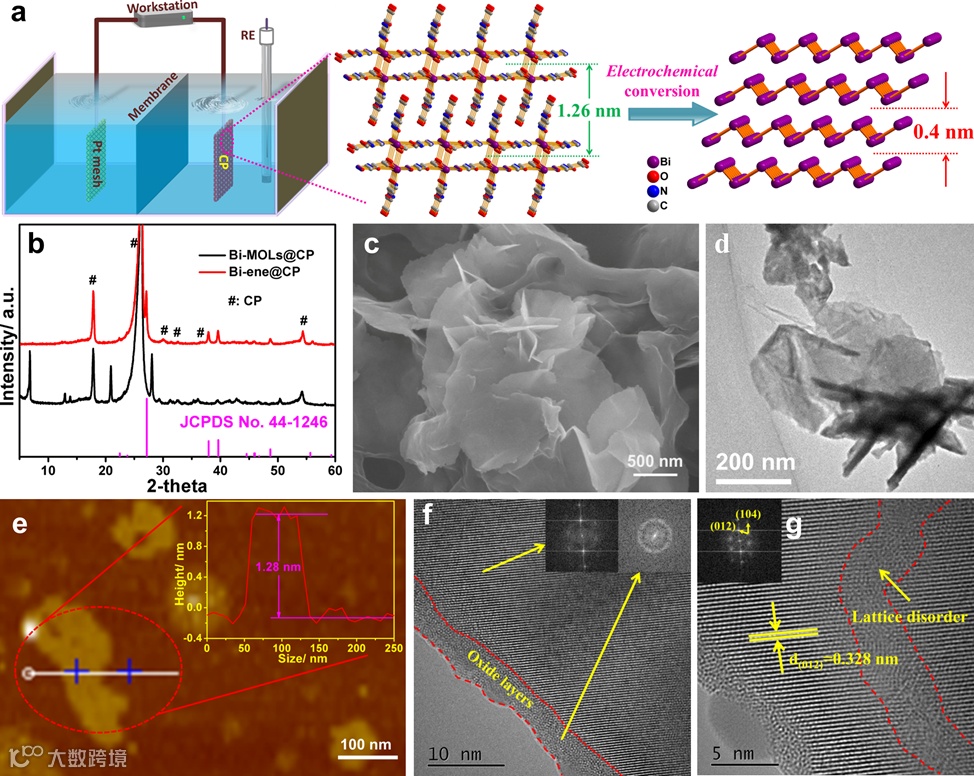 通过前期调研我们发现已有些许例子通过超声剥离或者Bi基化合物为前驱体,合成Bi纳米片,但鲜有厚度薄至寡层乃至单层的Bi-ene例子。结合MOLs材料具有更多可调的化学结构和二维形貌等特点,我们将目光转向以Bi基MOLs为前驱体,通过原位还原转化获得具有超薄结构的Bi-ene材料。经过合理选择配体以及原位电化学转化条件,我们最终成功获得了厚度仅为1.28-1.45 nm的超薄Bi-ene纳米片。因此,我们认为该设计思路为开发高效的二维金属和金属烯电催化剂开辟了一条新的途径。