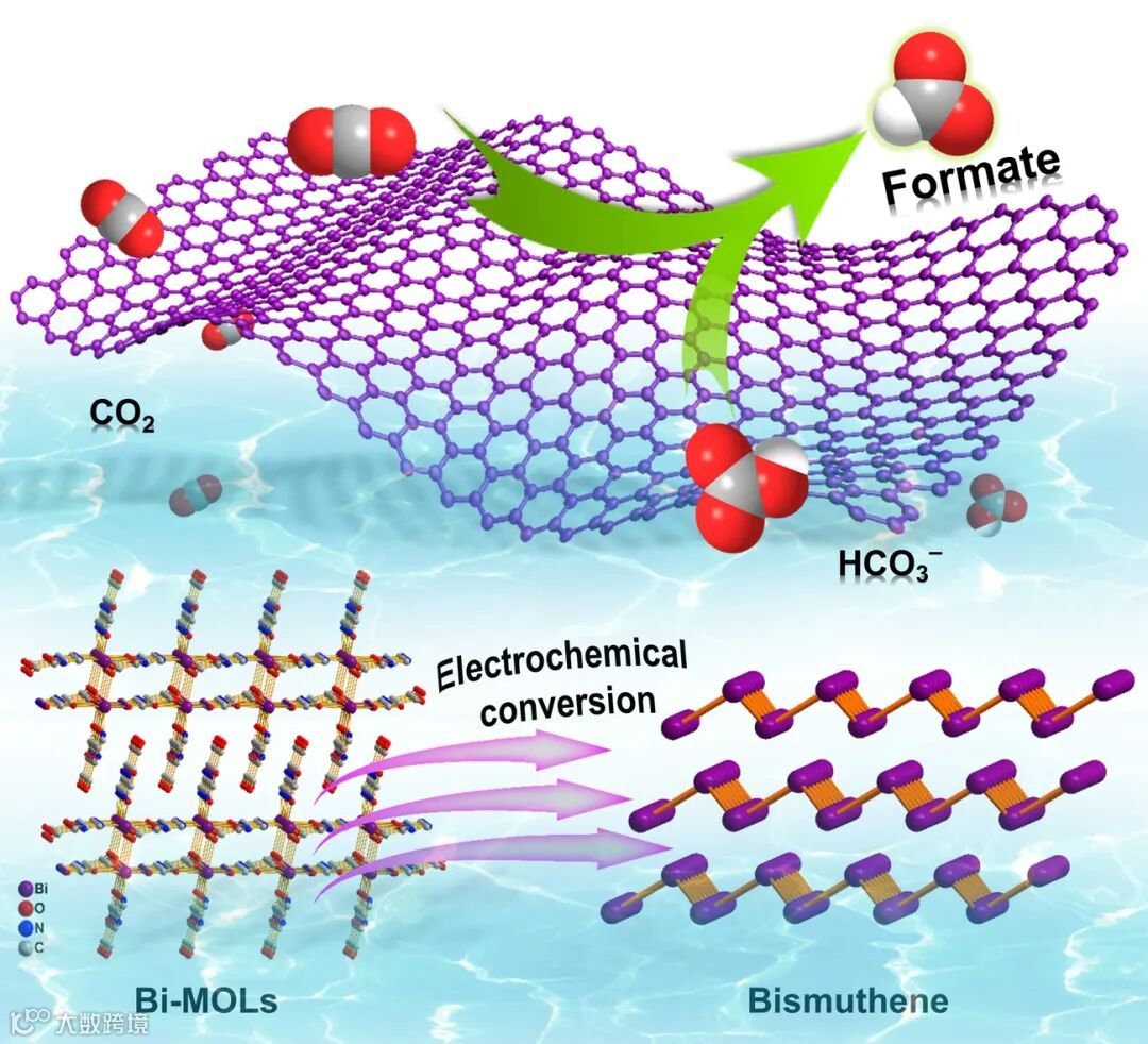 金属Bi作为一种二维层状半金属材料,已经被验证具有良好的电催化CO2还原产甲酸的能力。但目前报道的绝大多数Bi基电催化剂因其颗粒度或厚度偏大导致导电性差、活性位点暴露不足,严重限制了其电催化性能。因此,为进一步提高金属原子的利用率和本征活性,设计合成具有超薄二维结构的Bi-ene材料将有望显著提升其CO2RR性能。