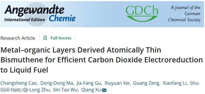 近日,中科院福建物构所朱起龙研究员,日本产业技术综合研究所徐强教授等在国际知名期刊Angewandte Chemie上发表题为“Metal-Organic Layers Derived Atomically Thin Bismuthene for Efficient Carbon Dioxide Electroreduction to Liquid Fuel”的论文。曹昌盛博士为本文第一作者。